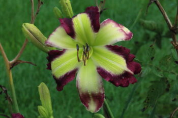 Emerald Meteor is another daylily with white midribs with the result being a star like appearance and the name included a meteor. There is a lot of green in this flower with a nice contrast between the dark purple band and the bright green throat. Unique among this year’s diploid introductions is the ruffled edge.