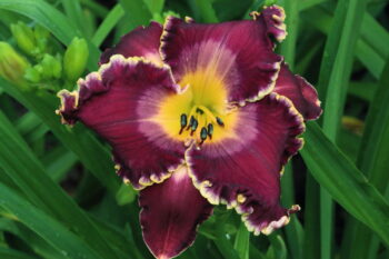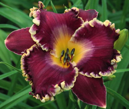 Breeding with daylilies can be fascinating and surprising.  The unique feature of Redemption Day is the edge and throat that have distinct orange tones to them.  Neither parent displays that trait, so the orange color is a surprise to us.