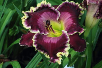 Dark purple with blue/lavender watermark, green throat, and a white, toothy edge.